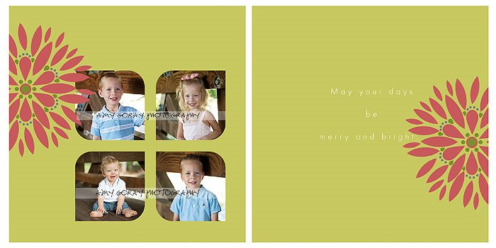 I know it’s only October, but the holidays are just around the corner! I wanted to give you a peek at my 2010 Holiday Card Collection to get you thinking about what is coming up! They are completely customizable flat double sided cards – some are 5 x 7 and the squares are 5 x 5. They are the perfect way to show off your family’s beautiful portraits! They are available to past and new clients. I do have a limited number of sessions available in the next month or so, so please contact me to schedule!